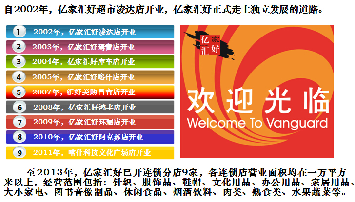 億家匯好商貿(mào)有限責(zé)任公司于2002年成立,并從臺灣引進連鎖經(jīng)營職業(yè)管理團隊,統(tǒng)一管理旗下各地的連鎖超市。公司通過多年的穩(wěn)健發(fā)展,至2013年底,億家匯好商貿(mào)有限責(zé)任公司已成為擁有員工近3000多人,下轄一個配送中心和9家連鎖超市的大型綜合性零售企業(yè)。總經(jīng)營面積11萬多平方米,配送中心輻射公司所有超市,年配送額可達(dá)2億元。公司大量吸納下崗職工,經(jīng)過崗前培訓(xùn),提高勞動技能,實現(xiàn)了他們的再就業(yè),為維護社會和諧穩(wěn)定做出了貢獻。2013年,巴州億家匯好商貿(mào)有限責(zé)任公司在自治區(qū)零售業(yè)中穩(wěn)踞前三位,是自治區(qū)重要的流通龍頭企業(yè),2013年年銷售收入達(dá)10億人民幣。多年來,公司一直重管理、抓實效、運用先進的管理手段和營銷理念,秉承億家匯好人 時時尋求效率創(chuàng)新,事事講究專業(yè)技術(shù)的文化精髓,創(chuàng)造了良好的經(jīng)濟效益和社會效益。公司先后多次被消費者協(xié)會評為誠信單位,并多年被評為重合同,守信用單位。